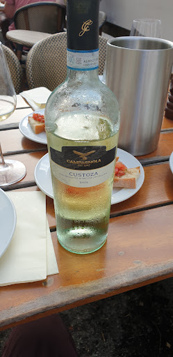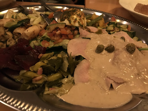 Zuerst nur die Stichpunkte: Ungefragt brach die Bedienung einfach einen Futternapf mit Wasser für unseren Hund, sehr aufmerksam Bruschetta gab’s als Begrüßung, sehr nett Gemischte Antipastiplatte war sehr lecker mit verschiedenen Gemüsen und Kalamari, sehr gut Linguini mit schwarzem Trüffel machte die Bedienerin auf Wunsch kleiner als Vorspeise, sehr nett und lecker Linguini mit Vongole (einmal als Vorspeise und einmal normale Portion) war leider nicht wie erwartet in Tomatensoße und nicht in Venusmuschelsud Linguine mit Pulpo war leider auch wieder in Tomatensoße Rinderfilet mit Parmesansoße war sehr lecker Gemischte Fischplatte war eher gewöhnlich Leider bei fast allen Gerichten (Pasta mit Tomatensoße, Rinderfilet und Fisch) waren gelbe, grüne Zucchini- und Karottenstreifen, aber en masse Die Räumlichkeit ist ziemlich laut, auch wenn sie nicht so groß ist, wahrscheinlich wegen der hohen Decke ohne Schalldämmung