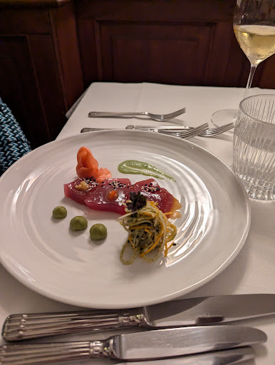 Read moreKleines aber feines Lokal in der Hackenstrasse.War jetzt schon länger nicht mehr dort, jedoch durfte ich die letzten Tage dem Lokal wieder einen Besuch abstatten.Betritt man das Lokal, so hat man die Qual der Wahl, zwischen verschieden grossen oder kleinen, verwinkelten Räumen, die alle über Durchgänge verbunden sind. Gemütlich ist es und auch wenn viel Gäste da sind, wird es nicht so laut und ungemütlich wie in einem grossen Raum, sondern immer klein und separiert! An der hohen Qualität des Essens und des Service hat sich zum Glück nichts geändert. Etwas legerer und lockerer wie früher kam er mir diesmal vor, was dem ganzen jedoch keinen Abbruch tut und man sich sehr wohl fühlt und gut aufgehoben.Betritt man das Lokal, wir einem schnell und freundlich ein Plätzchen vorgeschlagen und auch zugewiesen.Diesmal wurden wir mit einer Kürbiscremesuppe verwöhnt, die für mich etwas Kürbislastiger sein hätte dürfen, jedoch geschmacklich sehr gut war. Weiter dann Thunfisch auf Curryschaum und Salat, war der absolute Hammer. Leicht angebratene Thunfischstücke, innen noch "rosa" und in der gesamten Geschmackskombination mit dem Curryschaum wirklich Küche auf höchstem Niveau.Hauptspeise, dann Rinderfilet mit Kartoffelstampf und leicht anglasiertem Gemüse.Gemüse war noch bissfest und gut, leicht angeschmolzen. Der Kartoffelstampf leider für mich zu viel Püre, hätte also ein Stück bissfester sein dürfen, mit ein paar Kartoffelstückchen drinnen, geschmacklich aber super, mit Butter aufmontiert und schön sämig! Rinderfilet, einfach nur der Wahnsinn. Fein, innen leicht rosa, butterzart, so dass das Messer nur beim aufsetzen schon durchgeglitten ist. Somit ein Traum für den Gaumen und wirklich ein Genuss.Als Nachspeise, gabe es entweder Creme Brulee, Basilikumsorbet oder Schokotarte. Habe mich dann für die Creme Brulee entschieden und war begeistert. Sahnig sämig und sanft, viel echte Vanille drinnen, angenehm und nicht zu viel...