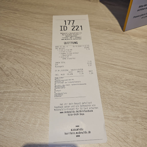 Wir 2 verfressenen Säcke sind extra 2 Stunden mit dem Auto um 3 Uhr Nachts dort hin gefahren weil in unserem Gebiet einfach nix ist. 25min auf eine einfache Bestellung (Big Rösti mit Pommes Fanta und ein Mc Crispy) gewartet. Koch putzt sich die Nase mit der Hand und greift dann die Burger an und genauso war das Genusserlebnis. Hat geschmeckt wie 5min vor Feierabend mit eine Prise extra kein Bock. Nie wieder, 15€ und dafür seit 2h am Klo und abwechselnd kotzen und den braunen...