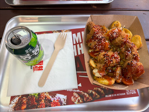 First of all, I was excited about the opening of this new restaurant and I think that their concept idea to combine two culturally different cuisines into one (Korean and German/European) is good. Furthermore, I enjoy their designs from commercial posters to the interior; which gives a nice and modern atmosphere. The staff was very fast and friendly too. Now to the food: We ordered Teriyaki Chicken with rice, Bulgogi BBQ Potatoes with Veggie Mandu, and two Yuza Lemon Iced Tea and we paid 23,80€ in total. The Bulgogi BBQ tasted good and had a nice smokey bbq aroma, the Veggie Mandu was okay but nothing special in my opinion, and the Teriyaki Chicken with rice was a bit bland too..we didn't enjoy the Yuza Lemon Iced Tea at all, can't recommend it. All in all, it is a nice option for a quick lunch and worth a try, but it just didn't...