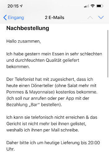 Ich habe mehrere Male mit dem Telefonisten telefoniert, er hat mir versichert, dass ich mein Gericht am nächsten Tag per App oder Anruf nachbestellen kann. Als ich auf Lieferando die bestellung tätigen wollte, (eine zweite Change geben um eine positivere Kritik verfassen zu können) wurde das Gericht (Dönnerteller) aus dem Sortiment genommen. Zunächst dachte ich an einem versehentlichen Fehler, weshalb ich mich dazu entschlossen habe dort anzurufen. Insgesammt habe ich es 6 mal versucht, jedoch ohne Erfolg. (Um blos eine Rückerstattung zu vermeiden!!!!) Solche Aktionen zeigen mir, dass man nicht einmal 20 Cent für dieses Unternehmen ausgeben soll (Damit man sowas mieserables nicht unterstützt).