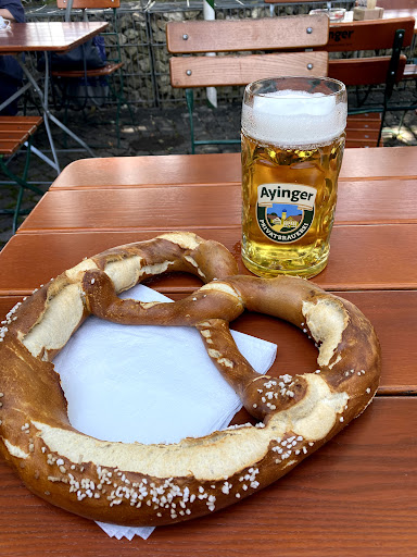 Klassischer Biergarten-Flair durch die Selbstbedienung - es gibt große Getränke - allen voran ein wohlschmeckendes Ayinger-Bier ... und angesichts des Standorts auch echt okaye Preise. Die Riesen-Brezn rentiert sich hinsichtlich des Preis-Verhältnisses zu den kleinen Brezn auch deutlich und wirkte auch überraschend frisch.