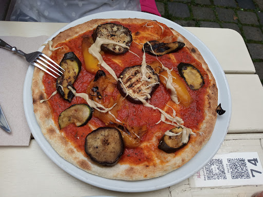 Leider war die Vegan Pizza nicht die angegebene Pizza mit Kürbis sondern "die Pizza Vegana mit Cashew-Mus, gegrillte Paprika, Zucchini und Auberginen" auf der Standardkarte. Es hat uns zwar trotzdem gut geschmeck, aber wir fanden sie etwas sparsam belegt: es gab nicht viel Gemüse darauf und vor allem war das Caschw-Mus etwas wenig (siehe bitte das Foto) und für 12,9 € (wie die Pizza Vegana sonst kostet) ist es etwas teuer.