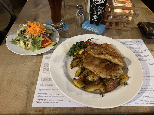 Wer hätte das vermutet, dass sich hier so ein tolles Lokal befindet? Außen ein sehr schattiger Biergarten, der sicherlich bei schönem Wetter sehr gut besucht ist. Das Restaurant selbst ist mit viel dunklem Holz eingerichtet und auch die Wände sind bis auf 2/3 Höhe vertäfelt mit dunklem Holz. Eigentlich wie ein typisch bayrisches Wirtshaus. Etwas auflockernd wirken da die schönen Bilder. Weniger schön fand ich die Bierhumpen. Die Beleuchtung ist aber sehr schön und angenehm. Bequem zu sitzen war es auch, allerdings schon sehr eng gestellt, sodass man zwangsläufig die Gespräche am Nachbartisch verfolgen konnte.