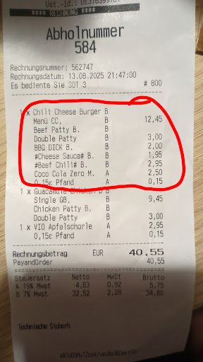 I tried the BBQ Bacon Burger menü and Chili Cheese Currywurst Spezial mit Softdrink. There are a variety of sauces placed in front of the store. Both dishes were ok.