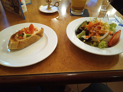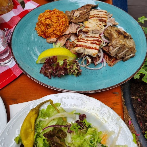 Nice place with Biergarten. We came with a bunch of friends and sat outside but in case of rain it would have been covered. A friend could place her baby trolley and another friend with a 2 year old got offered a sort of baby sit to put on the bench but overall it isn't kods friendly. There is no Spielplatz beside a sort of toy outside but located next to the parking so it is convenient to park but not great for kids. We were offered some uzo as a starter and a greek yoghurt scoop with some marmelade for dessert. I ordered a Kreta Teller with well marinated and cooked meat and liver for 16,5€ that I gladly shared with a friend. I probably ate 70% of it as she had less apetite. The whole plate would have been too much for me anyway. The service is ok but...