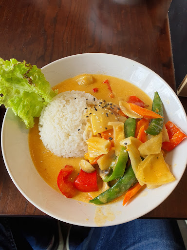 I ordered the Thai Red Curry chicken for €9.8. The chicken breast was cooked to a tender best and a delicious savoury red curry doused all over a healthy mix of vegetables. The rice.. fluffy cooked jasmine rice drizzled with sesame seeds on top — perfect combination.