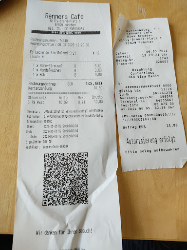 Read moreIch habe mich heute um halb zehn mit einer Freundin in den Riem Arcaden beim Renners Cafe´getroffen. Der Herr an der Theke (graues Haar) war zwei mal vorne, hat irgend etwas aufgefüllt und verschwand wieder nach hinten. Kein guten Morgen oder Grüß Gott, Hallo, etc....keine Ahnung ...irgendwas halt. Nach einem gnädigen Kopfnicken von ihm kam er dann auf uns zu und meine Freudin hat gefragt, ob wir denn schon ein Frühstück bekommen könnten. Zu unserer Freude sagte er ja. Wir verzehrten bis um 12.00 Uhr: drei Cappuchino (der letzte ohne Schaum und hat traurig gemundet), ein Frühstück mit dreierlei Frischkäse Aufstrich und ein Frühstück mit Aufstrich, Marmelade und Croissant. Anschließend noch eine große Flasche mit Mineralwasser und eine Saftschorle. Als ich beim letzten Cappuchino um ein Glas Leitungswasser gebeten habe, sagte mir der Herr, das geht nicht. Ich habe gesagt: Was, zum Cappuchino kein Glas Leitungswasser? Er sagte: Nein und wenn dann gibt es nur ein kleines Glas für 50 oder 60 cent (Habe ich leider nicht mehr genau verstanden, da ich mich schon kopfschüttelnd entfernt habe) Das war heute keine schöne Erfahrung und vielleicht sollte man hier ein wenig kundenorientierter denken.