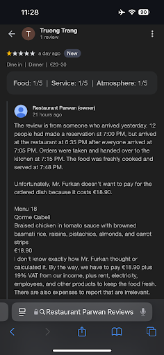 One star again for the misleading. We did not visit yesterday and do not know who are the people the restaurant’s owner has mentioned. You could have asked what was the reason for bad review, so you can improve it. I believe no restaurant has perfect service nor can satisfy every customer. However you choose to make the whole story up instead and tried to frame someone for what they did not do. I have noticed that I am not the first one you combat with but with every single customer who gave bad review and consider them as competitors. Then should whoever who gave good review be your allies, relatives or acquaintances? How do we have the exact same problems like others: super slow service, dishes were canceled 40 mins after ordering even though we were the very first customers who came to the restaurant that day. Please spend your time in improving your service rather than combating with your source of...