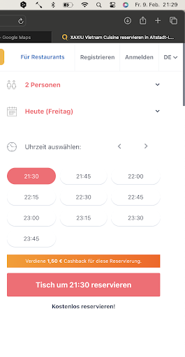 Ich war das 2. Mal hier, da ich beim 1. Mal vom Essen überzeugt war. Beim 1. Mal Besuch unter der Woche, heute an einem Samstag. Online gebucht für 19 Uhr, 2. Personen, um 20 Uhr wurden wir aufgefordert zu zahlen, da der Tisch ein weiteres Mal reserviert sei. Wir hatten gerade die Hauptspeise beendet. Hätten noch gerne einen Nachtisch genommen & unser Getränk ausgetrunken. 1 Std. Belegungszeit geht gar nicht & ist viel zu kurz. Bei der Onlinebuchung wurde nicht darauf hingewiesen, dass der Tisch nach 1 Std. verlassen werden muss. 87 EUR für 2 Personen und 1 Std Zeit insgesamt ein "no go". Da gehe ich zum Streetfood-Vietnamesen - gibt es jede Menge sehr gute in München. Ist billiger und schmeckt genauso gut! Unsere Getränke haben wir draußen ausgetrunken. Gott sei Dank war es heute trocken bei ca. 12 Grad (Föhn in München). Mein Freund hat sich vor Ort beschwert. Der Chef meinte er solle sich wieder setzen. Nun ja leider zu spät! Gastfreundschaft geht anders. So geht es auf jeden Fall nicht. Wir wollten einen entspannten Abend verbringen bei einem guten Essen und mindestens einem Zeitfenster von insgesamt 2 Std. Leider war dies nicht möglich. Übrigens kann ich die Bewertungen nicht nachvollziehen, bei denen 40 Min auf das Essen gewartet wurde. Wart ihr wirklich in diesem Restaurant? Wir mussten nach 1 Std gehen. Liebe Leute so nicht! Dann macht aus dem kleinen Laden doch gleich einen "Vietnamesischen Imbiss"! Oder noch besser verzichtet auf 3-4 Belegungen der Tische am Abend. Belegt max 2 x. Restaurant oder Imbiss entscheidet euch! Ein weiteres Ärgernis: 1 Glas Wein wurde zu viel berechnet (immerhin 7,50 EUR). Durch den Druck des Kellners, abzukassieren, blieb noch nicht einmal Zeit, die Rechnung zu checken. Fiel mir erst zuhause auf. Ich komme Montag mit der Rechnung...