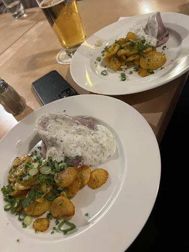 My partner and I went to this place looking for great food and music. While we did find the food was nice and at a good price, little did we know that you had to double your spendings on "tips" for the band. A lady came around with a hat, and forced us into spending much more than we were comfortable with in tips for a mediocre band of old men. She humiliated us in front of the rest of the crowd by saying we needed to keep giving more and more money (starting with 10€ each, and when we gave that, changed her mind to 15€ each). It was an extremely uncomfortable situation, and I don't recommend anyone on a budget, or new to Munich/Germany, or under the age or 60, to go to this establishment....