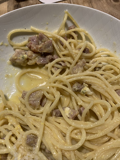 Nächstes Gericht: eine Spaghetti Carbonara. Entschuldigen Sie, aber jeder Italiener, der ein wenig was auf sich hält, bekommt dieses Gericht besser hin. Die Soße war wässrig (zu viel Nudelwasser?), das Eigelb war stückig gestockt, und der Speck… eigentlich gehört Pancetta rein. Aber diese unfassbar festen Speckwürfel sicherlich nicht. Noch dazu lag noch etwas Linguine mit im Teller. Es tut mir leid, eine schlechte Bewertung abzugeben, weil es mir einfach schwerfällt, jemanden so offensichtlich zu kritisieren. Aber ohne Kritik wird sich nichts ändern.