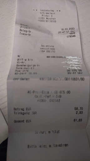 Read moreEstaba muy lleno, y tras dar vueltas y más vueltas encontramos un sitio al aire libre, aunque algo lento, todo fue aceptablemente bien. Nos pedimos un schweinshaxe (17,9€) unas rostbratwurstl 8 uds(11,9€), un bretzel (1,6€) y de beber una jarra de cerveza de un litro (10,4€) y otra de medio litro (5,5€) en total debería haber sido 47,3 €. La comida está aceptable, y la cerveza muy muy buena. Pero a la hora de pagar fue donde nos timaron. Para pagar con tarjeta había que ir con el camarero adentro asi que fui con el, empezó a hacerse el simpático preguntando de donde éramos y al decirle que español, dijo que el era croata y que si conocía a Luka Modric... aprovechando la situación me dijo que eran 58,7€, no había calculado cuanto era en total pero me pareció algo de mas, pero no le di mas importancia, para colmo me dijo que la propina era obligatoria si le daba el 5% o el 10%, le dije el 5% así que el total fue 61,63. Pague y me fui.