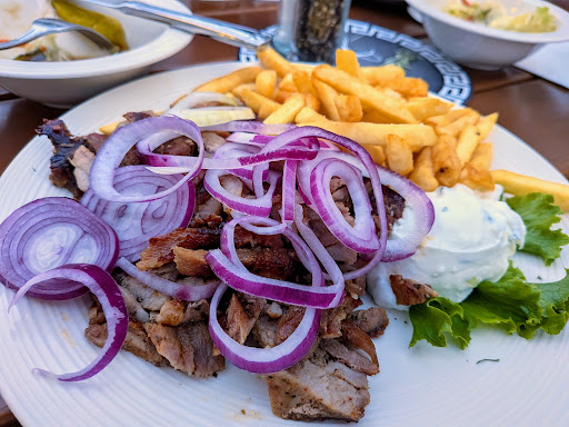 The salmon had a light, crispy exterior and a flaky, juicy center with clean, bright seasoning. The gyros were well-spiced and wrapped in warm pita, and the souvlaki came juicy and smoky with a nice tang from lemon and herbs.