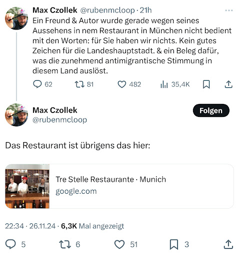 Ein Restaurant ist ein Ort, der für Gastfreundschaft und kulinarischen Genuss stehen sollte, unabhängig von Herkunft, Aussehen oder Hintergrund seiner Gäste. Hier jedoch wurde eine klare Grenze überschritten. Es ist nicht nur eine Frage des schlechten Services, sondern eine Frage von Menschlichkeit und Respekt, die in diesem Fall völlig gefehlt haben.