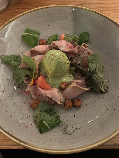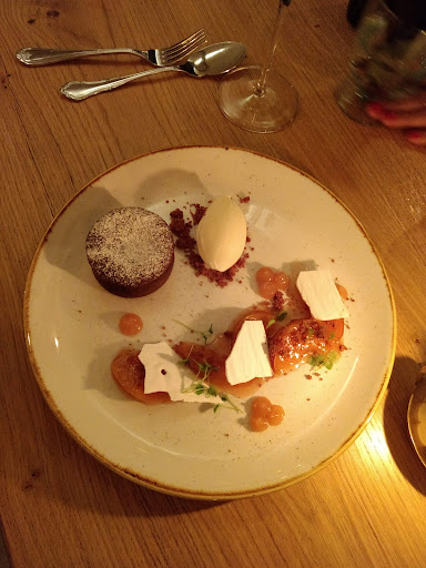 Read moreLet’s start with the ambiance. The vaulted ceilings, the wood furniture and paneling, the low light brass chandeliers bearing the royal crown and crest, and the wall paintings make you feel like you’re dining in a medieval tavern. The food is excellent. Traditional ingredients with a modern twist. The starter was veal with a poached egg and candied. Hazelnuts. It was a lovely combination with each element working harmoniously together. I like liver so I opted for a main course of a calf liver “Berlin Style” with apple and mashed potatoes. A rich and flavorful wine sauce tied it all together. The chunks of liver were juicy with added layer of deep flavor from the sauce; and the dish had a very modern presentation. The dessert was a cheese curd mouse with plums, currants and raspberries. With a nice level of tartness, it was light and felt like a great transitional dessert between summer and fall. Great place! Staff was knowledgeable and...