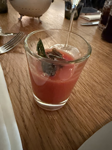 Glad that the pre-dinner theatre was over, we settled in and ordered our food. They gave us a little amuse-bouche, a cold tomato soup in a small glass with some basil. It was simple and delicious.