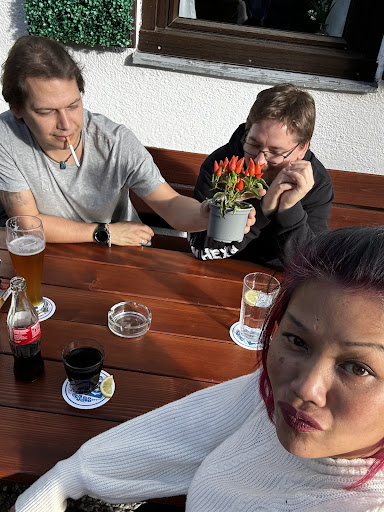 Endlich wieder Biergarten Freundlicher Empfang durch eine Charlie-Chaplin-Figur am Eingang. Kein Schattenplatz in Sicht doch bald war ein netter Kellner an unserem Tisch, der gleich einen Schirm aufspannte. Ich bestelle einen Russen. Für die Nicht-Bayern: das ist Weißbier gemischt mit Zitronenlimonade. Das Pendant zu Radler = Helles gemixt mit Limo. Der Kellner war sich nicht sicher, ob sie das hätten. Aber ich hab’ ihn überzeugt, immerhin stehen sowohl Weißbier als auch Limo auf der Karte. Und als Münchner Biergarten ist ‚Russn’ ein Muss. Jegliche Politik bitte außen vor, der Mix heißt hier nun mal so. Obwohl wir vorgewarnt wurden, dass das Essen etwas dauern könne, standen unsere Teller recht zeitnah auf dem Tisch. Für mich als Vegetarierin gab‘s Spargelcremesuppe mit viel Creme, ein paar Spargelstücken und krossem Brot. Sehr cremig, sehr gut. Meine Eltern bestellten Curry-Wurst XXL und Wurstsalat. Ersteres war so wie es sein soll und beim Wurstsalat waren die Scheiben nicht dünn genug geschnitten. Aber das ist natürlich absolute Geschmacksache. Als Nachtisch gab‘s Tiramisù und Meindl-Café. Warum die den in Rechtshänder-Tassen anbieten, verstehe ich als Linkshänderin absolut nicht. Das fühlt sich mit dem gedrehten Henkel total verkehrt an. Naja, wenn man uns nur ließe, dann wären wir immerhin 50% Linkshänder/innen in der Bevölkerung und dann gäbe es weder diese Tassen noch Rechtshänderscheren oder Rechtshändermischbatterien usw, die für uns nicht wirklich funktionieren. Aber das mag verstehen wer will. Zurück zum Biergarten: Cooles Logo mit ‚unserem Olympiaturm‘. Bayrische Küche wie sie sein soll und super netter Service. Wir kommen wieder und freuen uns, dass wir jetzt ‘n Biergarten direkt nebenan haben. Alles Gute für euch. Oder wie man bei uns sagt: ‚Ois Guade & pfiads euch.‘ (Verabschiedung = von...