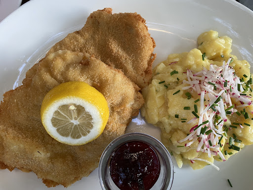 I really enjoyed the Schnitzel vom Schwäbisch-Hällischen Landschwein~Slices of pork marinated with mustard and horseradish, fried to a golden, yet tender crisp, with a generous squeeze of lemon depending on how you like it. You will find a small pot of berries on the side and I do suggest you drop a few on each bite! Served with a side of potato radish salad, and let me warn you, if you are looking for something sweet, this aint it! The radish gives this salad a spicy bite, what you are used to as “German Potato Salad” isn’t this at all and how wonderful is that! A must is always the red cabbage that is simmered in spices yet remains firm to the fork, and has a slightly sweet finish.