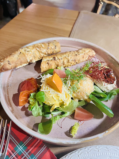 Tucked away down a street close to the main market square, sits this gorgeous restaurant decorated with the festive vibes of the season. My first impression walking in was “oh! How charming” and then received a warm greeting by the server/host who took me to my table and immediately offered me a beverage, a warm one to combat the rainy cold weather outside. She mentioned that they had the best Gluhwein in the city and it definitely did not disappoint. Looking through the menu, I chose the starter with the 3 dips. This on the menu „Heimatgedeck – I schmier da oane“ 3erlei Aufstriche: Lachstatar, Kürbis – Meerrettich und getrüffelter Dattel- Maroni Schmand, dazu unser Knusperstangerl. I loved everything about this meal. All 3 dips were so flavourful and I love truffle so I particularly enjoyed the date, chestnut truffle dip. For my main, I had the beef and it was mouth wateringly good - cooked to perfection. „Rindvieh“ Gegrilltes Rinderfilet unter der Maronikruste auf Balsamico- Schalotten, Rosmarin- Portweinjus, gebratene Waldpilze und Kürbis-Kartoffelnocken im Kräutermantel.