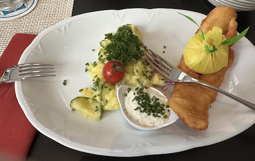 Aber wir hatten ja noch ein zweites Gericht bestellt: Backfisch mit Kartoffel-Gurken-Salat, ebenfalls für 18 Euro. Serviert wurde ein sehr überschaubares Stück Backfisch, eine ebenso übersichtliche Portion Kartoffel-Gurken-Salat (der dem Backhendl-Salat gut zu Gesicht gestanden hätte) und etwas Remoulade. Der Fisch war bis auf die Tatsache, dass die Panade süß schmeckte, geschmacklich in Ordnung. Es war frisch gebraten und saftig. Über den Kartoffelsalat brauche ich nicht viel berichten: Es handelte sich meiner Wahrnehmung nach um industriell hergestellten Kartoffelsalat aus dem Hause Kugler Feinkost. Der Koch hat dieses Produkt dann mit ein paar Gurkenscheiben zu seiner Kreation gemacht.