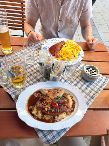 Read moreThe place is kind of touristic because of its central location in the middle of Marienplatz. The sausages with potatoes salat and sauerkraut tasted flavorful and hearty. Though it was kinda heavy but we shared one portion so it was okay. The Kaiserschmarren was really good. Some pieces at the bottom absorbed more butter so they were sugary and wet, but they were still very delicious. I liked the plum dipping sauce more than the apple because its sour flavor could balance the creamy pancake better to me. Seeing people walking by while enjoy your beer was also joyful. But I had to wait kinda long to get my...