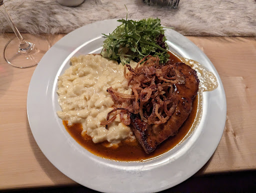 Read moreIch weiß nicht wie ich diese Rezension anfangen soll. Ich habe mich so gefreut auf den Abend. Wir haben zu 4. fast 400€ gezahlt, was für uns viel Geld ist. (Vor allem als Azubi) Man hatte seine Erwartungen. Beim Theater bzw. Krimidinner haben meine Erwartungen zugetroffen, weder positiv noch negativ. Ich habe heute extra wenig zu mittag gegessen, weil ich mich so aufs Essen abends gefreut habe. Nach einem Aperol (das beste des Abends) ging es dann mit der Gemüsesuppe los. Naja was soll ich sagen… sah aus wie eine Restesuppe, einfach wo man alles reinschmeißt, was man noch übrig hat. Aber wer hätte gedacht, dass die Suppe am genießbaresten sein wird. Dann kam der hauptgang. Ein riesen dickes Stück Hühnchen, mega trocken und versalzen. Daneben etwas gekochte karotten, blumenkohl und staudensellerie. Der staudensellerie war nicht mal geschält. Die sauce war wie eine fertige Maggi Sauce, aber noch verwässert. Ich habe es nicht mal zur Hälfte gegessen. Das Dessert… ja… wir hatten Apfelkücherl mit vanilleeis und sahne. Ich mag tatsächlich kein vanilleeis, weshalb ich die apfelkücherl so gegessen habe. Ich liebe es auch so. Eigentlich. Es hat so komisch geschmeckt, dass ich nur einmal abgebissen habe. Laut meiner Gruppe waren sie mit vanilleeis ok. Für den Preis eine Frechheit… ich werde dieses Restaurant nicht mehr betreten. Was noch hinzuzufügen ist: Ich habe noch nie meinen Teller in einem Restaurant so voll...