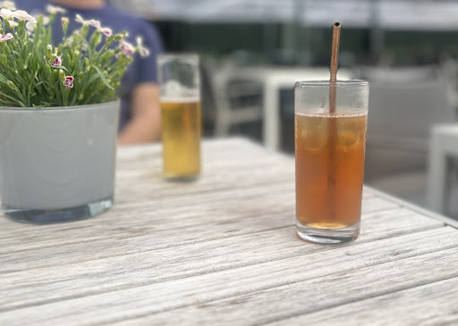 Der Tisch war schön gedeckt und der Kellner war schnell vor Ort. Wir haben ein Bier und ein Eistee Pfirsich bestellt, sowie eine Spargelcremesuppe und Currywurst mit Pommes.