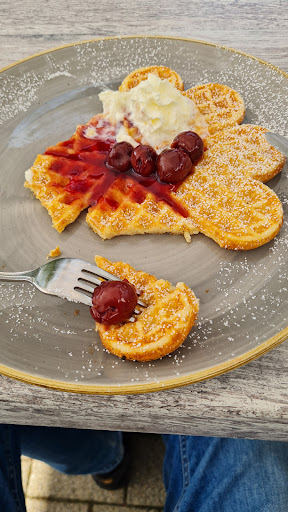 Das man hier, in dem Fall Waffeln, bestellt mit Kirschen und Sahne, dann aber einen winzigen Sahneklecks erhält und sogar ganze 8 Kirschen für die ganze Waffel, grenzt an Bösartigkeit.