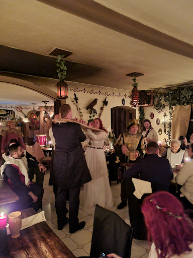 Das Positive zuerst: Ganz nettes Unterhaltungsprogramm, angemessene Dauer, schönes Ambiente. Die Mitarbeiter verstehen es, das Publikum mitzureißen und eine gute Stimmung zu erzeugen, das macht Spaß. Aber: Wir wurden von niemandem empfangen und als wir uns dann angemeldet haben, hat der Verantwortliche länger im Handy was gesucht. Nicht sehr mittelalterlich oder freundlich. Wir hatten für viele (über 20!) Personen reserviert, EINE Person wurde krank. Für diese Person musste man 35€ bezahlen, das ist nicht nur nicht erlaubt sondern vermiest einem auch sauber die Stimmung. Musik kommt beim überteuerten Empfang aus krächzenden Lautsprechern und hat mit Mittelalter nichts zu tun. Es werden ein paar Erdnüsse und Salzstangen verteilt für den Aufpreis. Auch nicht sehr mittelalterlich. Der "selbstgemachte" Honigwein wird in Ikeatassen gereicht, die rissig sind oder scharfkantig waren, weil Ecken herausgebrochen waren. Ob der Met selbstgemacht ist, wage ich sehr zu bezweifeln aber das kann ich nicht nachweisen. Die vegetarischen Menüs haben weder mit Mittelalter zu tun, noch sind sie den hohen Preis von 70€ auch nur ansatzweise Wert. Das andere Essen ist wirklich in Ordnung aber weder kreativ noch durchgängig mittelalterlich. Die Spiele beim Essen sind mMn doch etwas abgegriffen, da könnte man sich mehr Mühe geben. Das hat so was von kaum organisiertem JGA bzw. Hochzeitsspiele. Bei den hohen Preisen finde ich es nicht angebracht, noch ein Holzschwert für 35€ verkaufen zu wollen und im Anschluss an das Essen mit Trinkgeldanfragen per Beutel zu stören. Von der Ankunft bis zum ersten Essen vergingen fast zwei Stunden, da hätten wir uns gewünscht, dass man vorher besser durchs Programm geleitet wird.