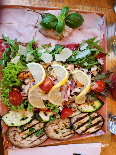 Read moreKürzlich war ich dort mit einer lieben Bekannten. Der Service ist sehr freundlich, hilfsbereit und, ohne aufdringlich zu sein, present. Es gibt eine schöne Auswahl an alkoholfreien Cocktails, was ich echt mag aber tatsächlich nicht getestet habe. Da ich keine schwere Mahlzeit wollte hatte ich mir die Antipasti Platte für 2 Personen bestellt (ohne Brot) und meine Bekannte eine Lasagne. Mein Grillgemüse war leider sehr langweilig, die Aubergine trocken und geschmacksneutral, die Zucchini zu roh und die eine gegrillte Paprika ohne große Grillaromen. Der Meeresfrüchtesalat war mir zuviel und geschmacklich leider kein Highlight; ich konnte den auch nicht leer essen. Das Vitello Tonnato war ok, aber es war kein richtiger dünn geschnittener Kalbsbraten, eher Wie ein Schinken (?), die Thunfisch Sauce war gut. Das hauchdünn geschnittene rohe Rindfleisch war so dünn, dass man den Teller fast sehen konnte und ging unter dem Berg Rucola völlig unter. Lecker finde ich die Kapernbeeren, davon gab es gleich zwei. Alles in allem war es gut, allerdings würde ich mir das nicht mehr bestellen. Die Lasagne sah gut aus, bewerten kann ich die nicht, weil ich sie nicht probiert habe. Gegen Ende unseres Aufenthaltes war die Bedienung leider nicht mehr so aufmerksam, allerdings trotzdem sehr nett.