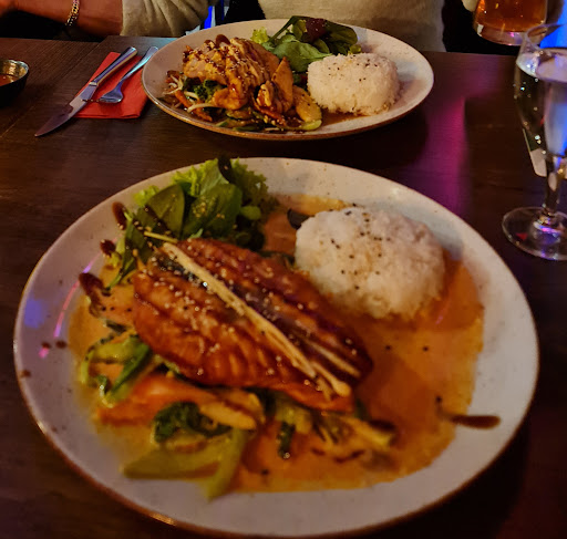 Keuzes op de menukaart zijn goed, wij kwamen voor een wok/bakplaat gerecht (plate-service). De zalm op bedje van gewokte groente in mama's currysaus met rijst was erg lekker! Andere tafelgenoot had de gegrilde kipfilet, zelfde saus, was ook erg goed.