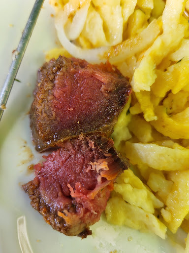 Essen: Zwiebelrostbraten - ein dünnes Stück Fleisch das durchgebraten war, darauf liegen fast rohe aber warme Zwiebel (Röstzwiebel???), dazu gab es Bratkartoffel die eher zu kurz in der Friteuse gelandet sind weil sie weder knusprig noch braun waren. Als Krönung wurde das ganze in Soße ersäuft.