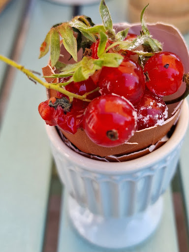 Nach rd. 40 Min. kam dann endlich unser Frühstück. Es war toll angerichtet und mit sicher hochwertigen z. Teil hausgemachten Produkten aber 3 Sorten ministückchen Käse wobei von der einen Sorte nur 1 kleines Stück zum Teilen war geht gar nicht. Der Quark war so überwürzt das man ihn nicht essen konnte, die beiden hausgemachten Salate schmeckten dafür nach nichts und die Johannisbeeren waren ungewaschen, da klebte noch der Dreck dran. Der nachbestellte Kaffee, welcher zusätzlich bezahlt werden muss, war dann zumindest heiß. Meine Freundin wollte gerne noch ein Glas Leitungswasser, bekam aber eine Flasche stilles Mineralwasser was sie nicht mag und die von mir bestellte Schorle war okay.