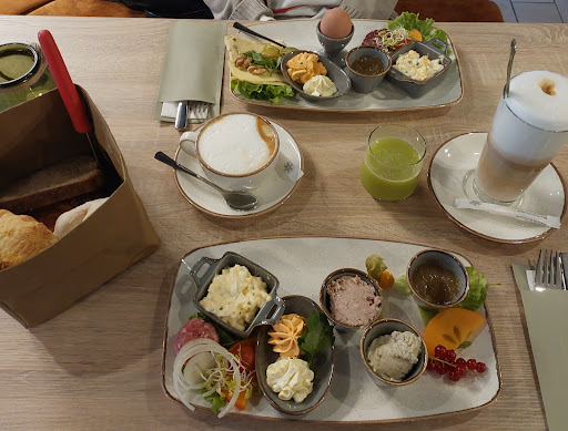 Read moreAuf dem Foto sieht man unten das Manufaktur-Früstück für 18,90€ und oben das Gute-Laune Frühstück für 15,90€. (Stand Dez. 2022) Die Preise scheinen auf den ersten Blick schon erhöht für ein Frühstück, ABER man muss schon betrachten, was alles enthalten ist: Pro Frühstück kann man sich ein Heißgetränk nach belieben aussuchen. Das heißt auch z.B. einen Latte Macchiato für 4,30€. Es gibt einen frisch gepressten Saft dazu! Dieser kostet woanders gern mal so ca. 3-4€ extra. Außerdem ist fast alles von den Belägen und dem Brot bzw. Brötchen selbst gemacht. Das alles ist im Preis enthalten. Rechnet man dies zusammen kommt man bei hoher Qualität auf ein sehr gutes Preis-Leistungsverhältnis. Der Service war ebenso sehr gut und die Location lädt zum Verweilen ein. Sehr gemütlich dort. Ich würde aber anraten zur Frühstückszeit zu reservieren, da es stets sehr gut besucht war. Wer also Wert auf Qualität legt, wird hier garantiert...