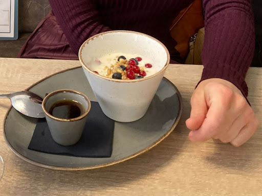 Reservieren lohnt sich auch für den Morgen unter der Woche. Der Service ist sehr freundlich, aufmerksam und schnell, obwohl alle Plätze belegt waren. Die Sitze sind nicht nur modern, sondern auch bequem. Der Essbereich mittig, wo wir saßen, wirkt recht gemütlich, die Fensterseite erinnert leicht an eine Kantiene, auch wenn die hängende Fensterdeko super liebevoll gewählt ist. Die Deckenbeleuchtung ist modern, wenn auch recht kühl von der Lichtart. In die Küchennische geschaut, wirkte diese viel gemütlicher als der Essbereich. Da die Tische relativ eng gestellg sind, kann man bei dem Nachbartisch super ungewollt mithören, könnte jedoch auch am Schallschutz liegen. Nach der Beschreibung der wählbaren Frühstücke sind diese vielseitig bestückt mit inkl. 3-4 Stück Brot/Brötchen. Der hausgemachte Tomatenaufstrich ist leicht und einfach. Die Frühstücksbowle ist von der Größe mit einem Dessert vergleichbar, der dazu gereichte Ahornsirup mild im Geschmack. Die Frühstücksbolw somit sehr einfach gehalten, wie auch das hausgemachte Granola. Aufgrund der kleinen Größe der Bolw, hatte ich mir doch noch einmal Rührei mit Frühlingszwiebeln bestellt, da es für mich sonst zu wenig gewesen wäre. Das Rühei ist sehr fluffig, in meinen Augen, optimal. Gern wahle ich das nächste ein Frühstück aus der Menükategorie...