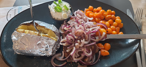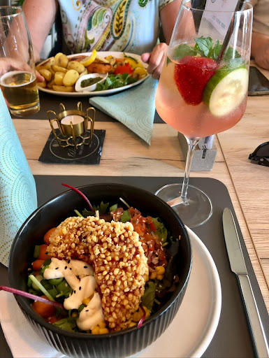 Read moreAn sich sehr modern und toll eingerichtet, auch im Außenbereich. Tja der Service... ich weiß nicht ob wir einen schlechten Tag erwischt haben, aber man hatte das Gefühl, die Bedienungem waren genervt und überfordert. Wir haben zunächst mehr als eine halbe Stunde warten müssen bis man unseren Wunsch zum Hauptgang erfragte und dann noch knapp eine Stunde bis das Essen dann serviert wurde... Ich hatte einen Salat zu einem intensiven Preis meines Erachtens nach bestellt, welchen ich mit einer Vinaigrette wollte, allerdings hat das ganze nach nix geschmeckt... Keine Kräuter, kein Essiggeschmack, nur Wasser und ein Tröpfchen Öl war mein Empfinden, mehr konnte ich auch am Grund der Schüssel nicht finden... Leider enttäuschend. An sich war alles nett angerichtet und zum Sattwerden reichlich in der Schüssel drin aber ohne eine gewisse Würze? Das hat mich nicht abholen können, da hätte ich den Salat auch frisch gewaschen aus der Verpackung naschen können... Die Gerichte der anderen sahen zwar wieder gut aus aber das Empfinden war auch hier nicht vollkommene Zufriedenheit laut 3 meiner insgesamt 5 Begleitpersonen. Die Toilette ist unglaublich eng, etwas dicker, hochschwanger sein - wie ich grade oder ein gewisses körperliches Handicap haben, sollte man lieber nicht, zumindest nicht als Dame. Wie die Herrentoilette ist, kann ich nicht sagen. Alles in allem eine leicht teure Angelegenheit bei einem nicht voll und ganz zufriedenen Feeling und Geschmack, aber tollem Ambiente. Kann man ausprobieren aber wir gehen nicht noch mal...