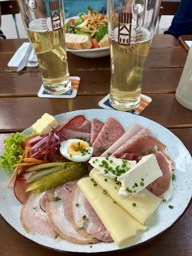 Read moreMit gemischten Eindrücken haben wir uns heute auf den Nachhauseweg gemacht. Im Rahmen eines Ausflugs nach Sanspareil haben wir hier Zwischenstopp gemacht. Per E-Mail reserviert, angekommen, eingecheckt mit App und am Platz hingesetzt. Soweit so gut. Der Hauptbiergarten befindet sich im Innenhof des Bräuwerks und weitere Plätze angrenzend zu einem Gebäude. Unser Platz war mittig im Innenhof und mit anderen Plätzen voll der Sonne ausgesetzt. Obwohl heute nur ca. 25 Grad herrschten, war es nicht auszuhalten. Selbst das Bier verschaffte keine Kühlung. Die Butter schmolz nur so dahin. Schirme waren nicht gut platziert und nicht verstellbar. 2 ältere Ehepaare neben uns fanden das ebenfalls sehr unangenehm. Der Innenhof könnte optisch noch etwas aufgepimpt werden. Die Wartezeit an der Kasse war ebenfalls sehr lang. Getrennte Kassen, Bier und Essen, würden das Ganze unserer Meinung etwas flotter machen. Für reine Nachtrinker wird das zweite Seidla so zur Geduldsprobe in der Schlange. Die getrennte Essensausgabe dauerte ebenfalls, weil die Dame alles frisch zubereitete bzw. die Teller belegte und stellenweise nur alleine war. Nun zum Guten: Ziebeleskästeller, Brotzeitteller, fränk. Wurstsalat und Dosenfleisch mit Meerrettichvinaigrette, alles superlecker... und optisch sehr ansprechend. Dazu genügend Brot. Das Kellerbier (Nachtwerk) ebenfalls sehr süffig. Abgerechnet wird zum Schluss: Preise für unsere fränkische Region - topp, 4 Essen und jeder 2 Getränke..50 €, was willst du mehr. Das Weizenbier gab es an diesen Tag nicht, sehr schade. Summa sumarum 3 Sterne, weil das Essen und das Bier den Tag versöhnlich...