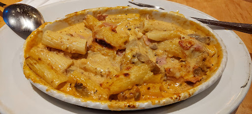 Read moreDie Pizza ist leider überhaupt nicht luftig. Die Tomatensoße ist sehr dominant. An Mozzarella hab ich Zweifel, eher Emmentaler mit etwas anderem gemischt. Das Knoblauchbrot ist einfach nur ein altes, nicht mal knuspriges, Baguette (nicht gebacken) mit ganz guten Knoblauchöl. Aber man sieht leider überhaupt nicht, dass es im Ofen war. Die Nudeln sind ganz ordentlich (al dente). Leider schmeckt auch hier der überbackene Käse überhaupt nicht. Außerdem war zu wenig Gorgonzola in der sonst recht sahnelastigen Soße.