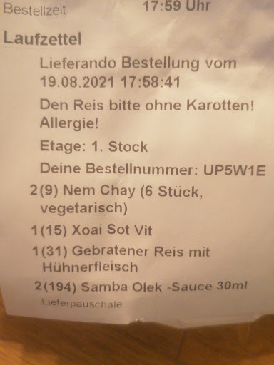 Wir haben um 18:24 Uhr über Lieferando bestellt. Bei Aufgabe der Bestellung zeigte die App, dass die Lieferzeit gewöhnlich 40-65 Minuten dauerte. Die Bezahlung erfolgte unmittelbar. Im Anschluss wurde durch das Restaurant bestätigt. Der angegebene Lieferzeitpunkt wurde mit 20:25 Uhr angegeben. Puh. Beinahe eine Stunde länger als erwartet. Leider war unsere Bestellung um 21 Uhr immer noch nicht da, sodass ich versuchte, das Restaurant telefonisch zu erreichen. Dort landete ich jedoch auf einer Mailbox. Etwa um 21:10 Uhr erreichte ich dort jemanden und ich erkundigte mich nach der Bestellung. Nach kurzer Rückversicherung sagte mir ein Herr, das Essen sei fertig, jedoch noch nicht auf dem Weg.