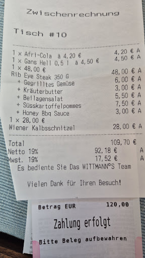 Read moreIch war gestern hier essen. Es war das erste mal das ich in einem Steak Restaurant in Deutschland zum Essen war. Das Restaurant hat eine sehr gehobene Innenausstattung und bequeme Sitzecken. Ich habe ein Ribeye 350g bestellt das mir so auch berechnet wurde. Mir ist am Tisch schon aufgefallen, dass der Knochen nicht zu einem Ribeye passt und das charakteristische Fettauge fehlt. Es war nicht so gut. Ich habe es fotografiert. Heute am Tag danach habe ich mehrere Fleischkenner aus Deutschland und sogar den USA gefragt um welches Steak es sich handelt. Es handelt sich um ein günstiges Clubsteak das bei Wittmanns Steak Restaurant 52° nicht einmal auf der Speisekarte steht.