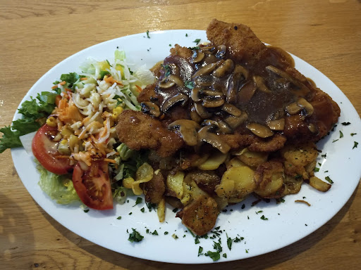 Wir bestellten ein Jägerschnitzel mit Bratkartoffeln und ein Zwiebelschnitzel mit Pommes - beide Gerichte ließen nicht lange auf sich warten, sahen einfach nur klasse aus und haben zudem noch super geschmeckt - einfach nur Note 1. Sogar die Chefin (die hier glaub ich selber kocht) kam zu den Gästen und war ebenfalls sehr nett.