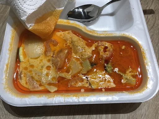 Die Soße war auch nicht wirklich eine Rotcurry-Soße. Das kenne ich von Thai-Konkurrenten ganz anders. Ich würde sagen das war eher eine Kokossoße mit etwas Chillipulver - und jede Menge Öl! Gemüse war ok- aber nicht sonderlich lecker, sodass es das Gericht herausgerissen hätte.