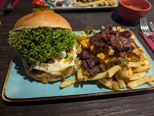 Read moreDer Laden ist absolute Spitze und hält was er verspricht. Die Qualität der Burger hat in Gänze überzeugt! Dass an den Zutaten und deren Zubereitung nicht gespart wird, schmeckt man wirklich. Das Fleisch ist hierbei besonders hervorzuheben. Es ist qualitativ hochwertig und mit Finesse gebraten (ich habe es Medium gewünscht und es war on Point). Der Salat macht den Burger beim ersten Anblick sehr sehr voluminös, was einfach daran liegt, dass dieser gefühlt gerade vom Feld geerntet wurde. Ähnlich ist es bei den Pommes, diese runden den Burger super ab, da diese auch aus regionalem Anbau sind und - soweit ich das mitbekommen habe - aus der Kartoffel "inhouse" produziert werden. Das Ambiente ist im Dinerstil gehalten mit einer rustikalen Theke. Sicherlich Geschmackssache, aber in meinen Augen ein schönes Zusammenspiel. Krönender Abschluss ist die Herzlichkeit mit der dieser Betrieb geführt wird. Man merkt, dass jeder dort möchte, dass man eine schöne Zeit verbringt. Man wird mit einem Lächeln Willkommen geheißen und verabschiedet. Betreiber und Personal ziehen an einem Strang und wenn es Mal kurz länger dauert, weil man sich für einen anderen Gast auch Zeit nimmt ist man nicht böse, weil es einem genauso geschieht. Preis ist hierbei mit ungefähr 17€ (Referenzwert ist mein Chili-Chese-Burger, Dirty Fries auf dem Foto kosten klar einen Aufpreis) für einen solchen Burger mit Beilage, bei dem was man heute oft für 25€ vorgesetzt bekommt, mehr als absolut gerechtfertigt in meinen Augen.