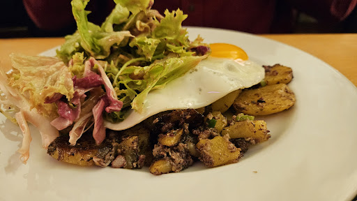 Read moreEin schönes Lokal in einem alten Fachwerkhaus. Das Essen war mäßig: Der Saumagen war gut, das Kartoffelpüree mit Sauerkraut dazu ... war o.k. Das Gericht hatte ich am Tag zuvor in einem anderen Lokal erheblich besser, sogar hervorragend gegessen. + Die "dreckigen Kartoffeln" = Bratkartoffeln mit Blutwurst, Spiegelei und Salatbeilage ... Von der Blutwurst war fast nichts zu schmecken, ein Hauch davon war unter die nicht besonders gut gemachten Bratkartoffeln gekrümelt worden, auf dem Teller abgedeckt mit einem Spiegelei. = für uns Preis-Leistungs-Verhältnis = unzufrieden! Dazu hatten war 2 unterschiedliche Weißweine bestellt. Nur einer davon war ordentlich gekühlt. Der Service war zwar freundlich, aber nicht sehr aufmerksam. Nochmal würden wir...