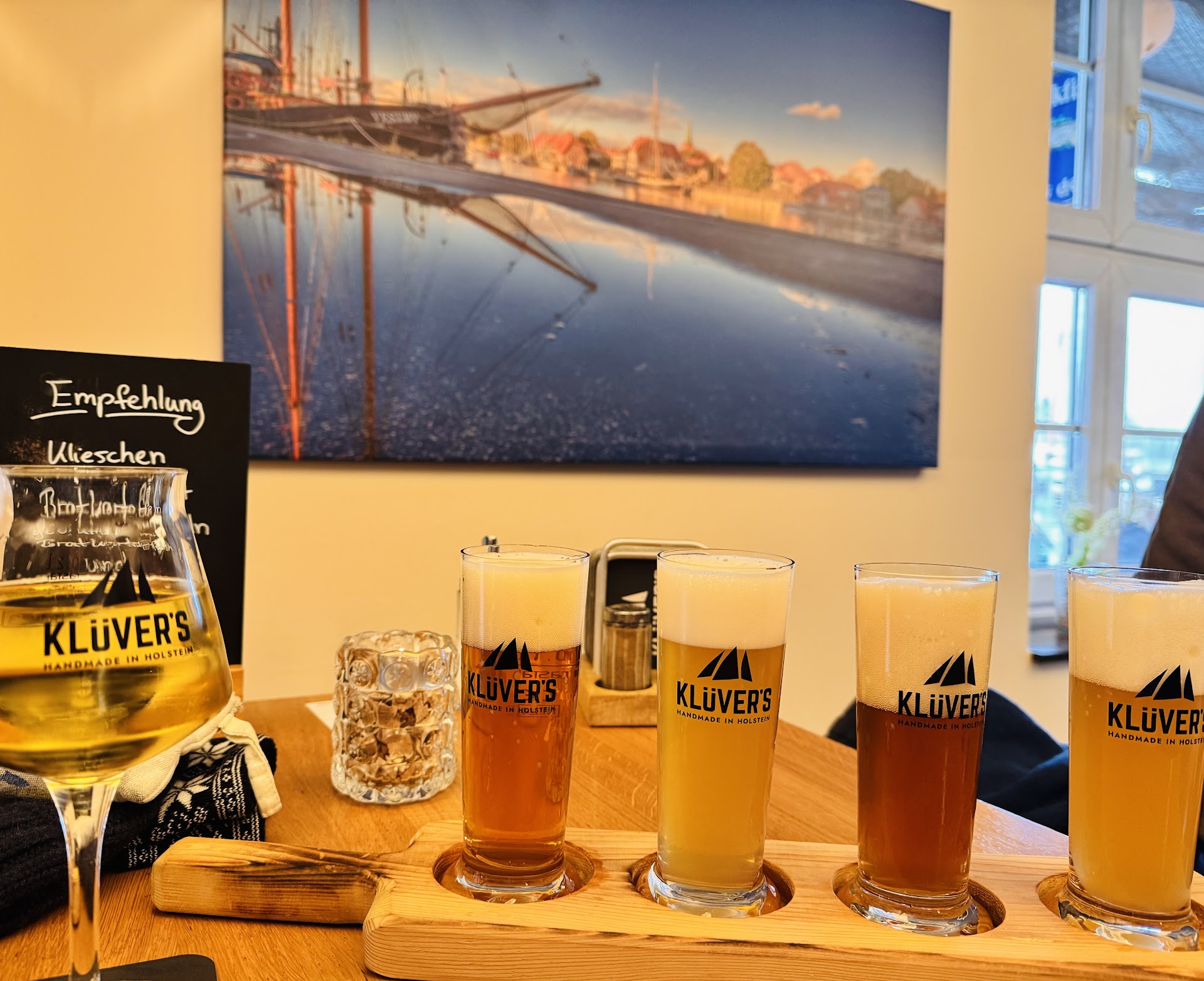 Refreshment in a relaxed and cozy atmosphere! The restaurant is directly located in the harbor of Neustadt i.H. We just passed by and the good looking beer tasting board (6,90€) invited us to the restaurant. So, we had a drink at Klüvers Brauhaus. The beer is self made and I can recommend to drink also a normal size, if you have chosen your favorite after the tasting. The glass of wine was ok but with 7,90€ a little bit expensive. The homestyle cooking and traditional food looked good but for me personally, the portions are very big. Due to the fact that we only had a drink, I cannot rate the food and it‘s just my perception. But Klüvers Brauhaus is a good...