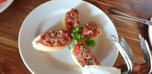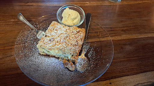 Read moreWunderschön gelegen. Tolles Ambiente. Man sitzt draußen an rustikalen schönen Holztischen. Zwei Holzöfen für Pizzen. Bedienung freundlich und aufmerksam. Manchmal dauert es ein wenig, da der Weg von drinnen nach draußen relativ weit und etwas unübersichtlich ist. Pizzen schön blasig und optisch sehr ansprechend. Teig schmeckt gut. Kinder damit sehr zufrieden. Zutaten für Belag leider recht simpel (Tomatensauce evtl. aus Tomatenmark, diese sparsam auf der Pizza verwendet und in sehr einfacher Zubereitung). Viel getrockneter Oregano. Antipasti ebenfalls sehr einfach gehalten (entsteinte grüne Oliven aus dem Glas, getrocknete Tomaten in Olivenöl eingelegt, Schinken um Wassermelone), typisches Antipasti-Gemüse ohne oder mit ganz wenig Knoblauch. Alle Speisen insgesamt nur bedingt mediterran gewürzt, ohne jede Schärfe/Säure, stattdessen mit viel trockenem Oregano. Dazu einfaches Weissbrot. Leckerer Parmesan kommt originell in kleinen Einweckgläsern. Spaghetti Carbonara kommt in sehr großer Portion, kaum Käse oder Ei enthalten, vor allem Sahne und Speck, garniert mit Frühlingszwiebeln. Salz/Pfeffer sehr sparsam verwendet. Saltimbocca schwimmt in Öl. Geschmacklich in Ordnung. Eis lecker. Zusammenfassung: Ambiente 5 Sterne. Essen schwankt zwischen 2 und knapp 4 Sternen (4 bei der Pizza). Bewertung wegen der freundlichen...