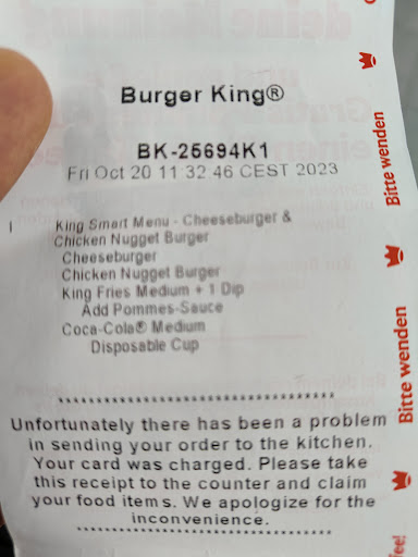 Read moreEinmal und NIE WIEDER! Waren dort auf der Durchreise essen, der 3 km entfernte an der Autobahn geschlossen hatte. Die Pommes waren lauwarm und hatten quasi kein Salz drauf. Den Wunsch beim Burger die Mayo wegzulassen, dafür eine andere Sauce draufmachen ging plötzlich nicht. Es geht wohl, da jeder Burger King bundesweit das macht. Da hatte man keine Lust zu. Der Chef fing an unfreundlich mit mir zu diskutieren und meinte guck, das steht sogar da in de App (es stand nirgends drin). Dann nahm ich 2x ein Menü (der Coupons). Am Ende musste ich fast das doppelte zahlen, da der das Menü regulär berechnet hatte. Zudem war einer der Getränkeautomaten außer Betrieb. Beim anderen gab es kein Eis und die Cola war komplett ohne Kohlensäure. Haben halb aufgegessen und sind gefahren. Zudem war es draußen überall schmutzig und um die Sauberkeit wurde sich auch kaum gekümmert. Also dieser Burger King gehört mit Abstand zu den schlechtesten, die ich je bsucht habe (und ich habe schon sehr viel in Deutschland besucht). Lieber den an der Autobahn nehmen. Die 3 km...