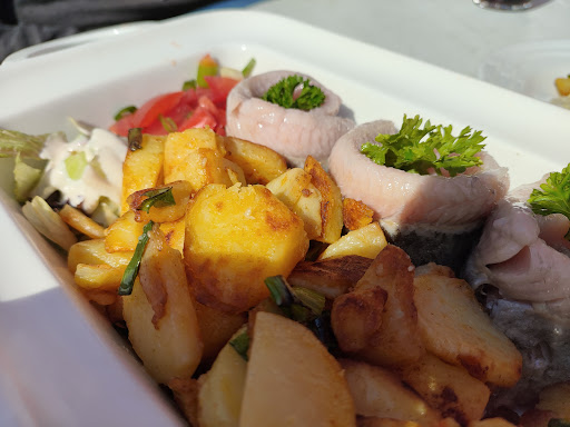 Mit humorvoll-lockerer Art umsorgte uns die Bedienung, war um keine Antwort verlegen und hinterließ einen angenehmen, engagierten Eindruck. Ebenso zufrieden waren wir mit unseren Speisen: Mühelos konnten wir aus Salzkartoffeln Bratkartoffeln werden lassen, die dazu noch mit Frühlingszwiebelgrün gewürzt waren und ebeno ausgesprochen lecker schmeckten, wie das Fischfilet und das Wirsinggemüse oder der Matjes. Drei große Filets, eingerollt und mit etwas Petersilie dekoriert, erfreuten Auge und Gaumen. Dazu eine vernünftige Portionsgröße, die uns weder übersättigte noch hungrig gehen ließ - was will man mehr!