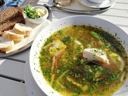 Read moreDie Aussicht von der Terrasse Richtung Nordsee oder Yachthafen ist sehr schön und versüßte uns die Wartezeit von 40min auf die Vorspeise: -Fischsuppe für 7,90 € (zwei Miesmuscheln sowie eine leere und zerbrochene Muschelschale, drei Stücke Fisch, ein paar Möhren-und Selleriestreifen in einer unglaublich salzigen Brühe) -Krabbensuppe für 7,90 € (kleine Tasse, Suppe lauwarm, aber einige Krabben enthalten)